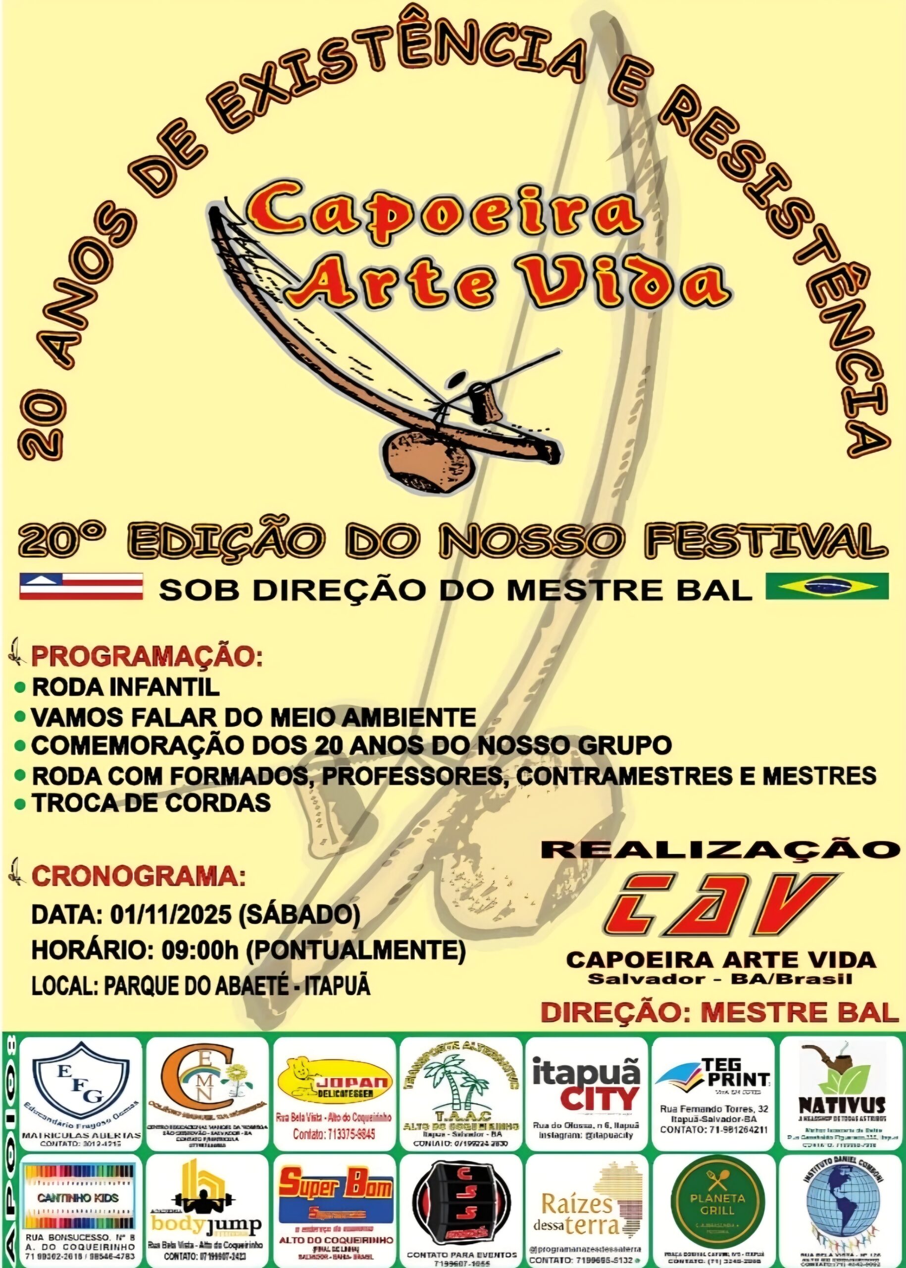 Neste sábado, 1º de novembro, o Parque do Abaeté será palco de uma grande celebração cultural em Itapuã. O grupo Capoeira Arte Vida (CAV) comemora 20 anos de existência e resistência, com a realização da 20ª edição do Festival Arte Vida, sob a direção do Mestre Bal.