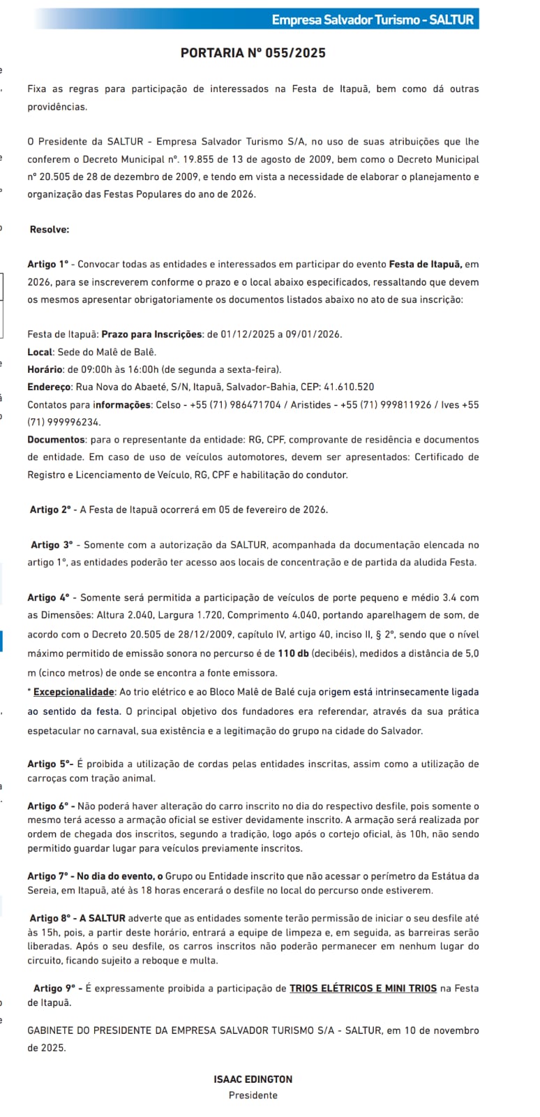 A Prefeitura de Salvador, por meio da Saltur, publicou no Diário Oficial do Município desta segunda-feira (10) a Portaria nº 055/2025, que estabelece as regras para inscrição de entidades interessadas em participar da Festa de Itapuã 2026, marcada para o dia 5 de fevereiro.