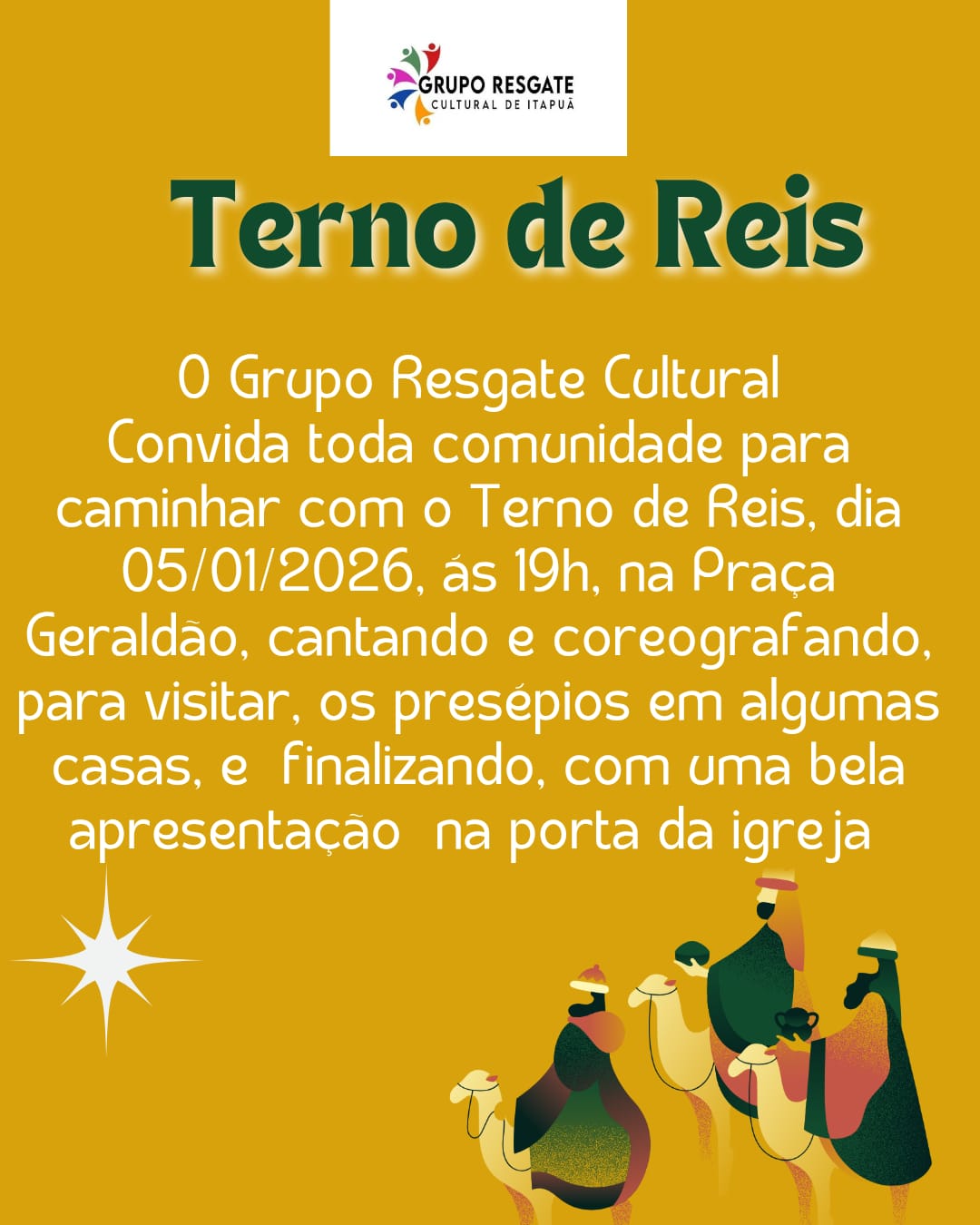 Itapuã volta a ser palco de uma das manifestações culturais mais tradicionais do calendário popular: o Terno de Reis. Nesta segunda-feira, 05 de janeiro de 2026, o Grupo Resgate Cultural de Itapuã convida moradores e visitantes para participar de uma caminhada marcada por música, fé e memória, a partir das 19h, com concentração na Praça Geraldão.